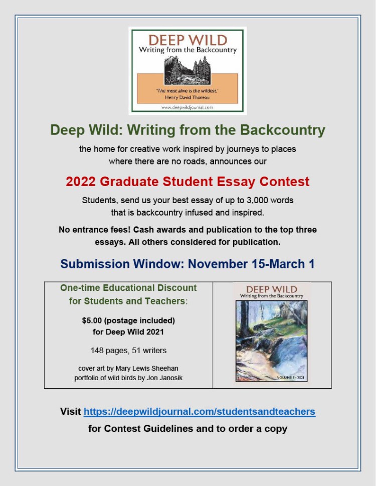 We can’t wait to read your essays! Students and teachers can also get Deep Wild 2021 at a discounted price. Visit https://deepwildjournal.com/studentsandteachers/ for contest guidelines and to order your copy.
