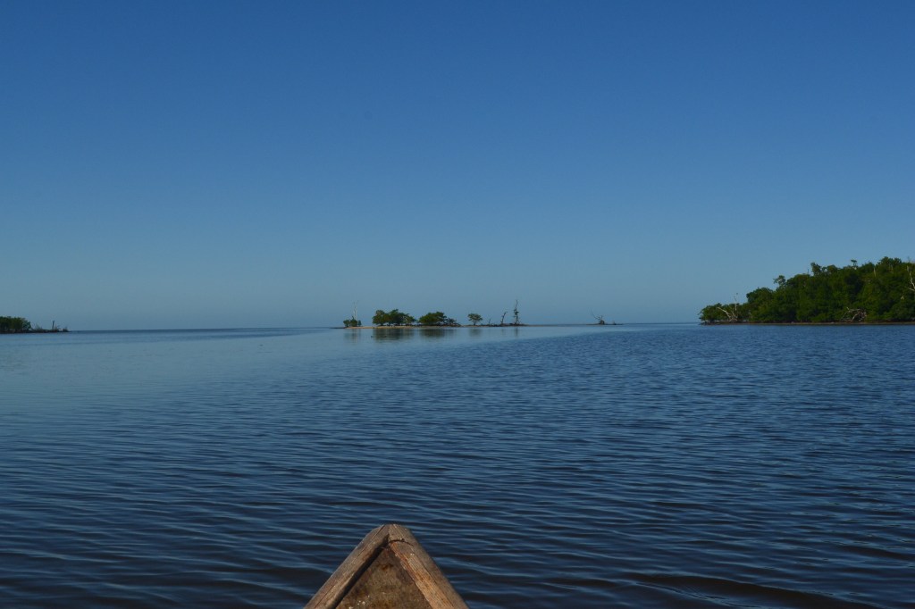Trace with your eyes the dark shapes of unnamed mangrove islands.
