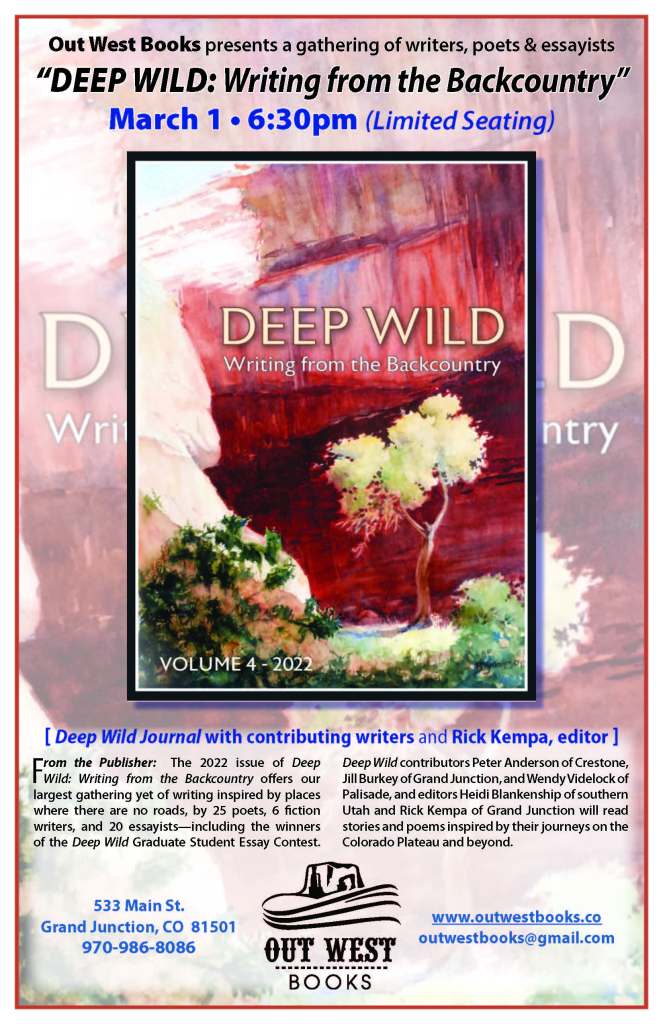 Five of us–Deep Wild Journal contributors Peter Anderson, Jill Burkey, and Wendy Videlock and editors Heidi Blankenship and Rick Kempa–will be putting some wild words in the air Wednesday, March 1 at Out West Books in Grand Junction and Friday, March 3 at the Lithic Bookstore in Fruita. On Thursday, March 2, Peter, Heidi, and Rick will light it up at the Moab Public Library.